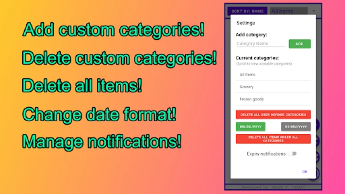 Just enter the item name and its expiration date, and the app will remind you when the expiration date is approaching. It will give you notifications 2 weeks before the actual expiry date. You have the option to disable/enable the notifications in the app’s settings.